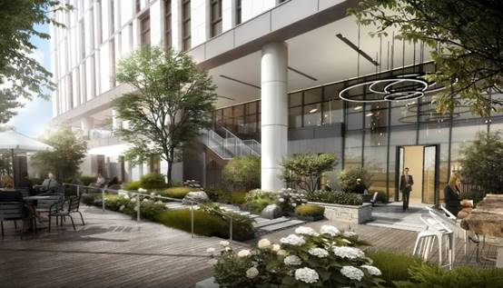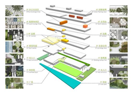 绿化从五大种植区域进行设计,以大乔木为主,打开下层空间,维护管理便利,结合铺装营造趣味性。通过将绿化引入室内,能够在工作中感受到植物的气息,获得乐趣与健康。